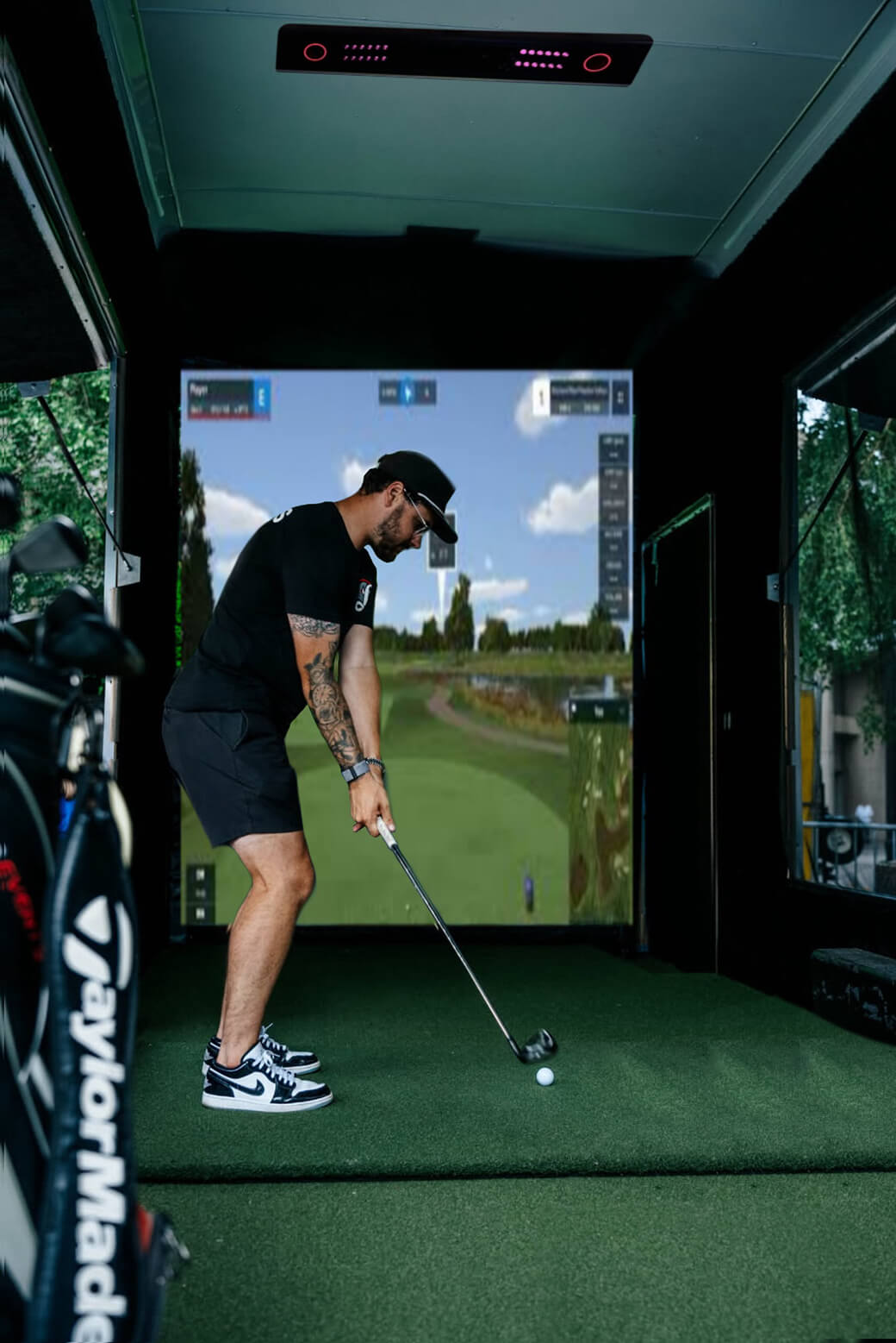 - It is an enclosed trailer fitted with impact screen, projector, launch monitor, turf, and software so people can hit real balls into a screen and play virtual courses.